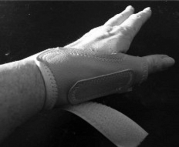 1. Attach the short thumb brace to the thumb hook velcro forming a thumb sleeve